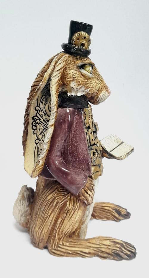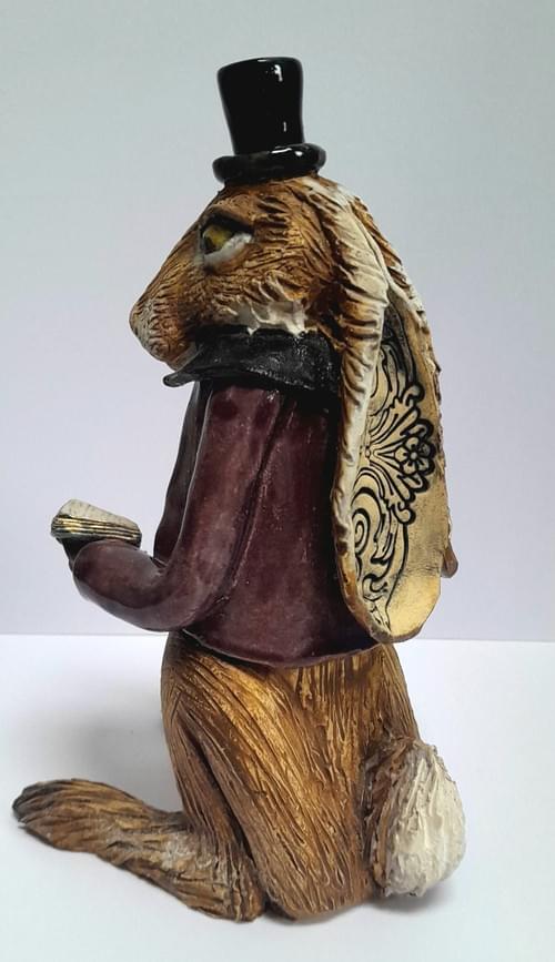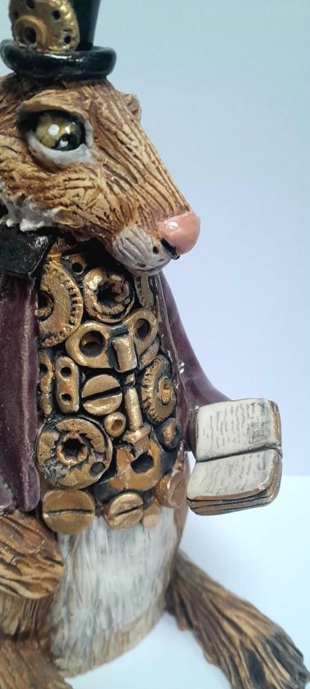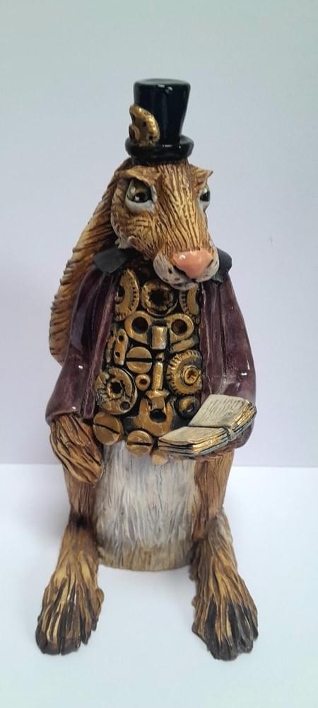 Highly detailed, handmade ceramic March hare with steampunk twist. 8 inches tall with a swirl pattern embossed inside his ears and holding a tiny book. Wearing a glossy glazed top hat and jacket. The textured fur body has a matt glaze. No two of my animals are exactly the same so you can own a 'one off' sculpture. His waistcoat consists of tiny clay cogs and wheels coloured with gold glaze. I also make variations where the hare holds a rose etc please feel free to contact me to enquire